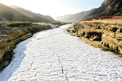 目前黄河吉县段流凌密度约为75%,流凌流经壶口瀑布后,在附近“十里龙槽”不断堆积抬升,形成流凌封河景观。由于黄河壶口段最低气温持续保持在零下10摄氏度以下,使得封河长度不断增加,长度约10公里。